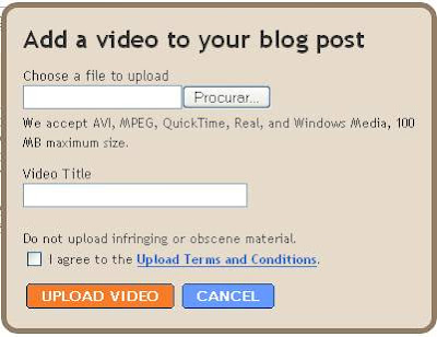 Hoje o google disponibiliza a possibilidade de fazer uploads directos ao escrever um artigo, ao lado do ícone de upload das imagens aparece agora um ícone que depois de clicado nos leva para uma janela onde escolhemos o vídeo que queremos incluir no post, damos um nome ao vídeo e depois é só enviar.